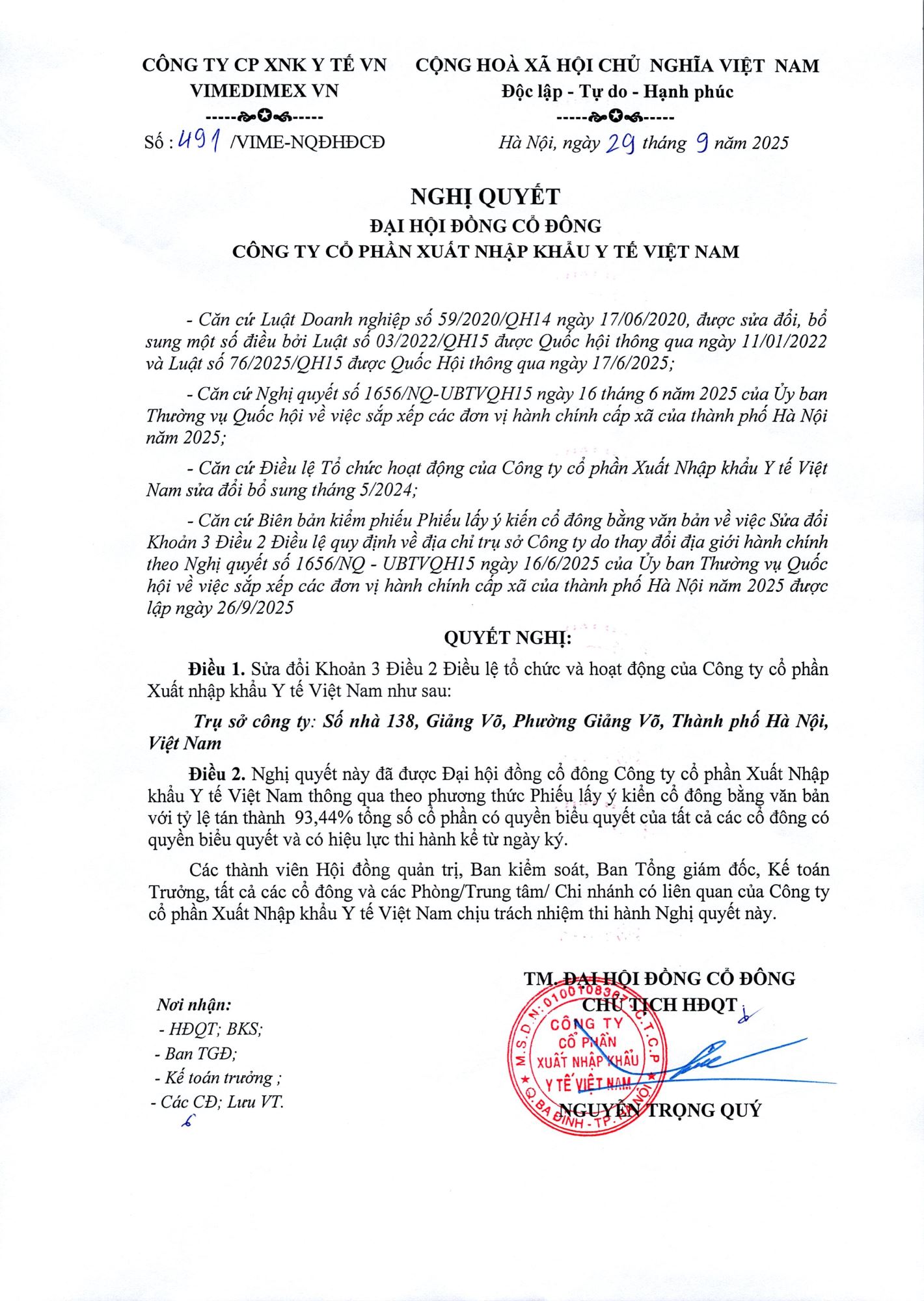 Nghị quyết của HĐQT Công ty về sửa Điều lệ Công ty 29/09/2025 Chia sẻ bài viết : Chia sẻ Tin cùng chuyên mục Thông báo chương trình khuyến mại mùa thu khi mua dây truyền dịch (08/10/2025) Thông báo thay đổi mẫu dấu Công ty (29/09/2025) Thông báo về việc thay đổi địa chỉ Công ty sau sắp xếp địa giới hành chính (04/07/2025) Chương trình Khuyến mại THÚC ĐẨY BÁN HÀNG DÂY TRUYỀN DỊCH (02/07/2025) Hình ảnh lễ khai mạc Triển lãm Quốc tế Chuyên ngành Y Dược Việt Nam lần thứ... (09/05/2025)